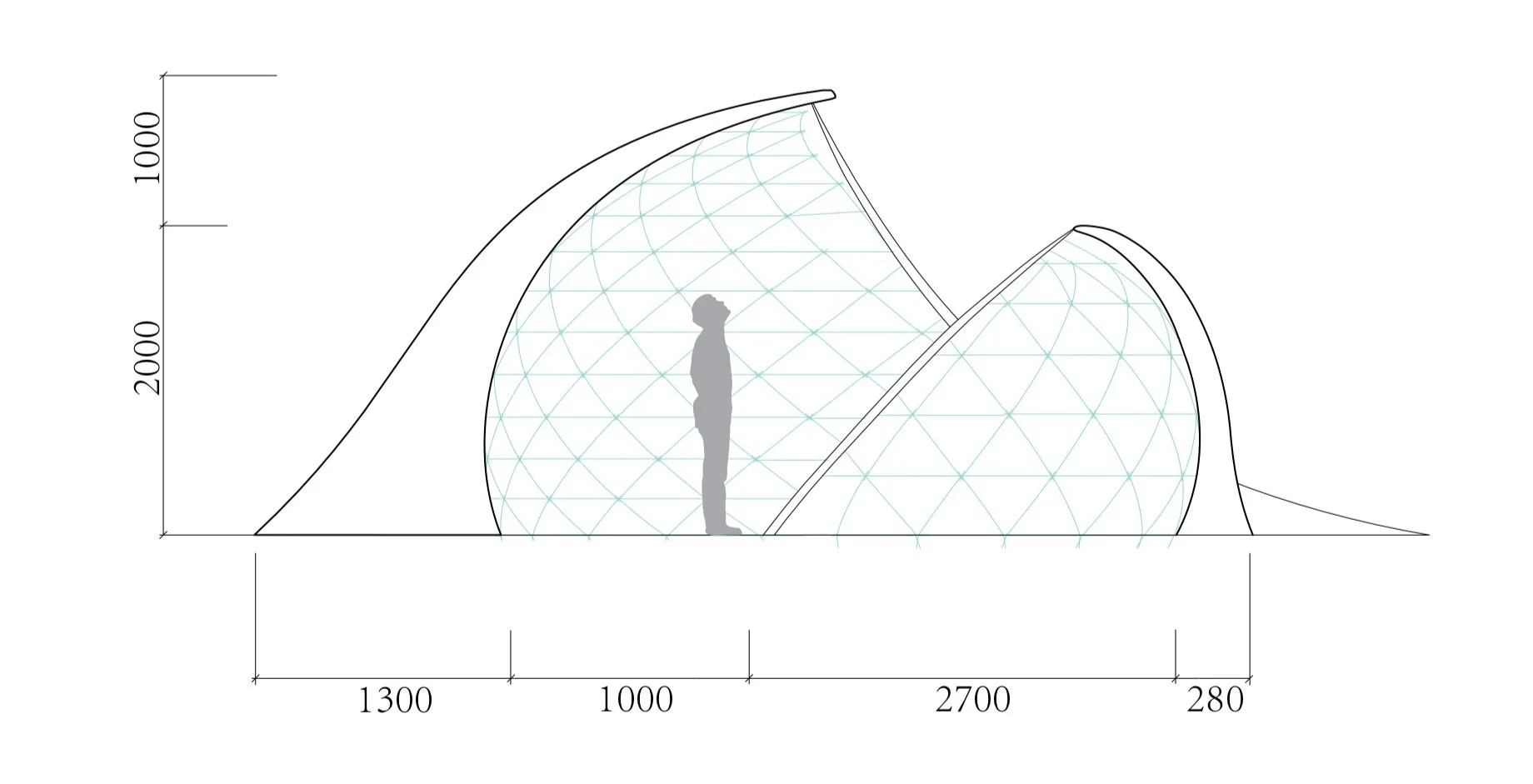The building process took 3.5 days with 6-10 people helping each day. Using a radial grid system, measurement points from the 3D model were extracted and referenced to create the physical form.